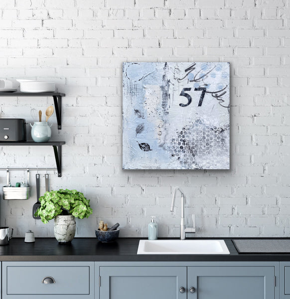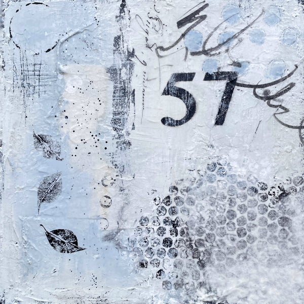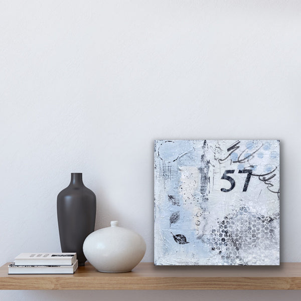 A modern, abstract painting in shades of blue/grey, white and black. The fun circles (or cercles) are painted in different styles and sizes. This piece has lots of texture and layers to explore, including handmade paper collage and a fun leaf print . Varnished to protect the beauty of the piece. This piece is perfect for a small space, as part of a gallery wall or to place on a table or shelf. Signed on the back and ready to hang.