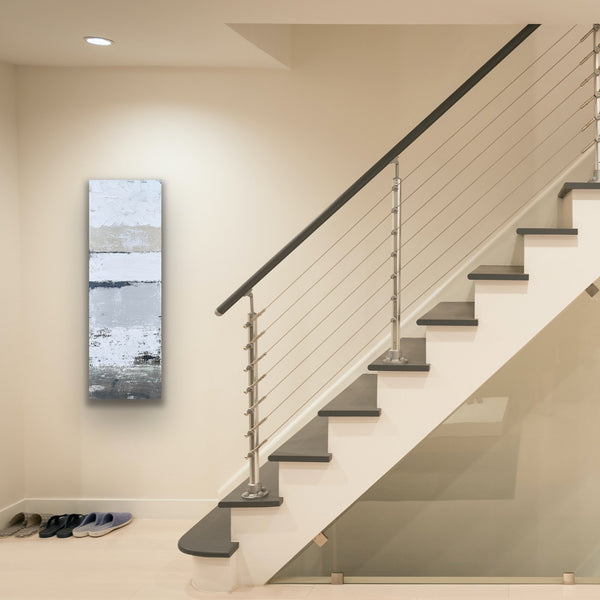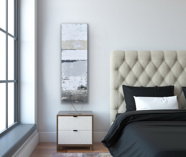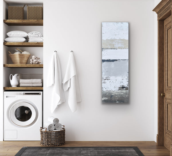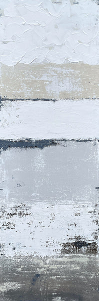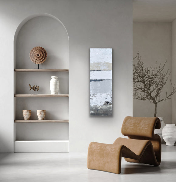Desert Beach #2 transforms narrow spaces into elegant focal points with its sophisticated 36" x 12" composition. This abstract landscape captures serene desert shores through textured layers of soft gray, titan buff, white, and taupe, with subtle dark gray accents adding depth. Professionally wired with dark gray painted edges, this high-quality acrylic piece arrives ready to display.