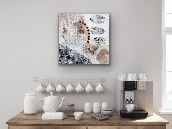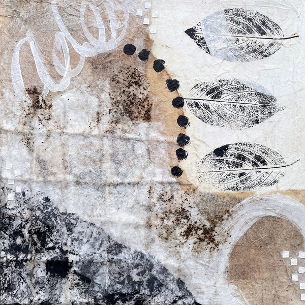 Mojave Vibes captures the essence of desert landscapes through layered mixed media. This 12" x 12" piece combines coffee-stained coffee filters, delicate tissue paper, and authentic hydrangea leaf impressions to create textured depth and organic movement. Warm earth tones and botanical stamping evoke a southwestern aesthetic, blending natural elements with artistic technique. A striking conversation piece that brings warmth and artistic character to any space. The sides are painted black making framing optional.