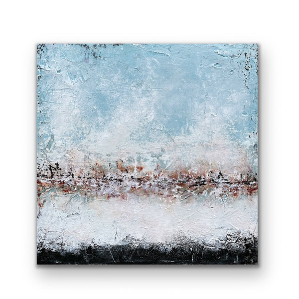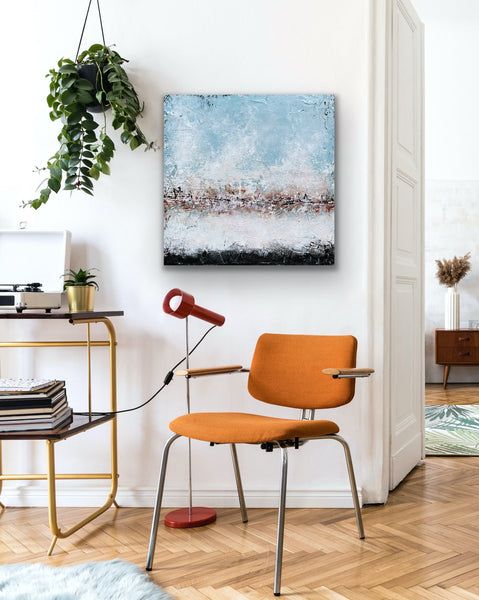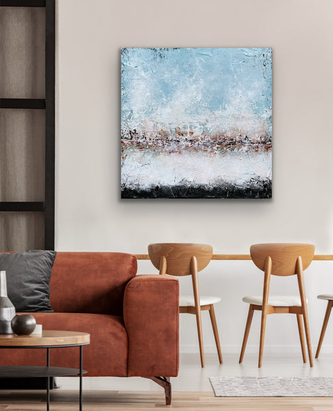 A sophisticated textured acrylic composition on gallery canvas featuring tranquil teal, burnt sienna, white, and deep brown hues that evoke an oceanic horizon. The 24" x 24" x 1.5" piece showcases meticulous layering techniques with dark brown-painted edges eliminating framing necessity. Premium acrylic pigments are preserved beneath dual satin varnish applications, enhancing depth while providing protection. This contemplative artwork arrives professionally wired, ready for immediate display.